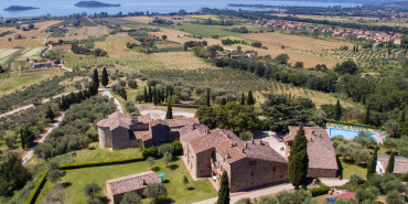 Unique heritage mansion on a 395-acre Gallo Nero estate, winery, oil mill, chapel, 2 pools, and farmhouses for sale in Castellina in Chianti, Siena. At 450 m above sea level, with a truly breathtaking panorama, Le Capraie Mansion dates back to the 17th and 18th centuries and dominates a 395-acres (160 hectares) estate boasting prestigious vineyards producing over 110,000 bottles of the finest Chianti Classico Gallo Nero DOCG wines each year. A classic cypress trees driveway leads to the main park featuring an Italian-style garden designed with fountains, belvedere terraces, elegant balustrades and travertine colonnades. Here is set a swimming pool with spectacular scenery and dominated by the splendid main façade of the villa, perfectly preserved in its original Vanvitellian-style architecture, with a tower, colonnades, arched windows, Renaissance-style stone decorations and a main entrance porch surmounted by a terrace. The interiors star charming and bright living areas throughout paired with antique furniture and fine decorations. The entrance hall has a grand staircase and wrought iron balustrade and connects three main reception rooms, two fabulous dining halls, one very impressive has over 6 meters high ceilings with central trusses and great arched windows, snooker room, study with library and 8 ensuite bedrooms. Amongst the park, a separate church building preserves Roman numeral dates and family names engraved in stone on the portal and main facade, and houses a consecrated chapel where private Catholic ceremonies are still celebrated. Slightly detached from the park are the 15th-century traditional stone farmhouses converted into 11 holiday apartments and a single-family villa, providing a total of 24 bedrooms, all in a rustic country chic style and with access to a second swimming pool. A typical hamlet, dating back to the 14th century, is the beating heart of the farm and houses a wine cellar with a fully equipped winemaking facility, cellars with oak barrels, vaulted rooms for wine aging, tasting rooms, a shop, offices, as well as an oil mill, farm outbuildings and staff quarters. The land is cultivated according to the centuries-old Tuscan tradition, is certified 100% organic, and includes 19.4 hectares of Chianti Classico Gallo Nero DOCG vineyards, 21 hectares of olive groves with 5,500 trees, a private lake, 105 hectares of woods, orchards, and arable land. Strategically located in the heart of Chianti Classico wine region, south of Florence and 25 km north of Siena, at an easy reach to all main Tuscan sites and road connections. The town center of Castellina in Chianti with shops, bars and all amenities it is at just 10 minutes’ drive, 7 km, with no gravel road.