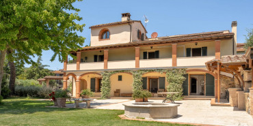 A refined Tuscan retreat on 8 hectares of land with a finely restored arched country house, a barn and a horse stable for sale east of Siena. Set amidst the gently undulating landscapes of the Valdichiana, just 30 minutes from Siena and within easy reach of Montepulciano and Cortona, this finely restored country house offers the essence of Tuscan living. Surrounded by 8 hectares of private land, the estate comprises a charming two-storey residence, traditional annexes, and a horse stable, all framed by timeless rural beauty. The main house spans approximately 413 square metres over two levels and is immediately distinguished by its graceful brick archways, a classic loggia, and a traditional courtyard paved with handmade terracotta tiles. The restoration has been carried out with great care, preserving original features such as exposed wooden beams, handcrafted terracotta floors, and solid wood finishes, which lend the interiors warmth, character, and an enduring sense of authenticity. The layout is thoughtfully divided into two self-contained residences, each with its own personality. The ground floor features a spacious country kitchen, an elegant dining room with fireplace, a cosy sitting area, three bedrooms, including one en-suite, and generous ancillary spaces. Upstairs, the second residence offers a light-filled open-plan living and kitchen area, a study, a master suite, two bedrooms, a bathroom, and ample storage. Outdoors, the paved inner courtyard provides a charming setting for al fresco dining, shaded relaxation, and gatherings with a view of the estate’s traditional brick barn. Currently used as a storage space, the barn offers exciting potential for conversion into guest accommodation or further living areas. A second annex at the rear of the property also serves as a utility area, while slightly set apart lies a well-equipped horse stable with fenced paddocks—perfect for equestrian enthusiasts seeking a country base. The surrounding land is a beautifully varied blend of mature olive groves, arable fields, forest, and landscaped gardens, offering both natural tranquillity and the potential for further landscaping, outdoor leisure areas, or the addition of a private pool. Perfectly suited as a refined family home, a peaceful rural escape, or a boutique hospitality venture in one of Tuscany’s most desirable locations.