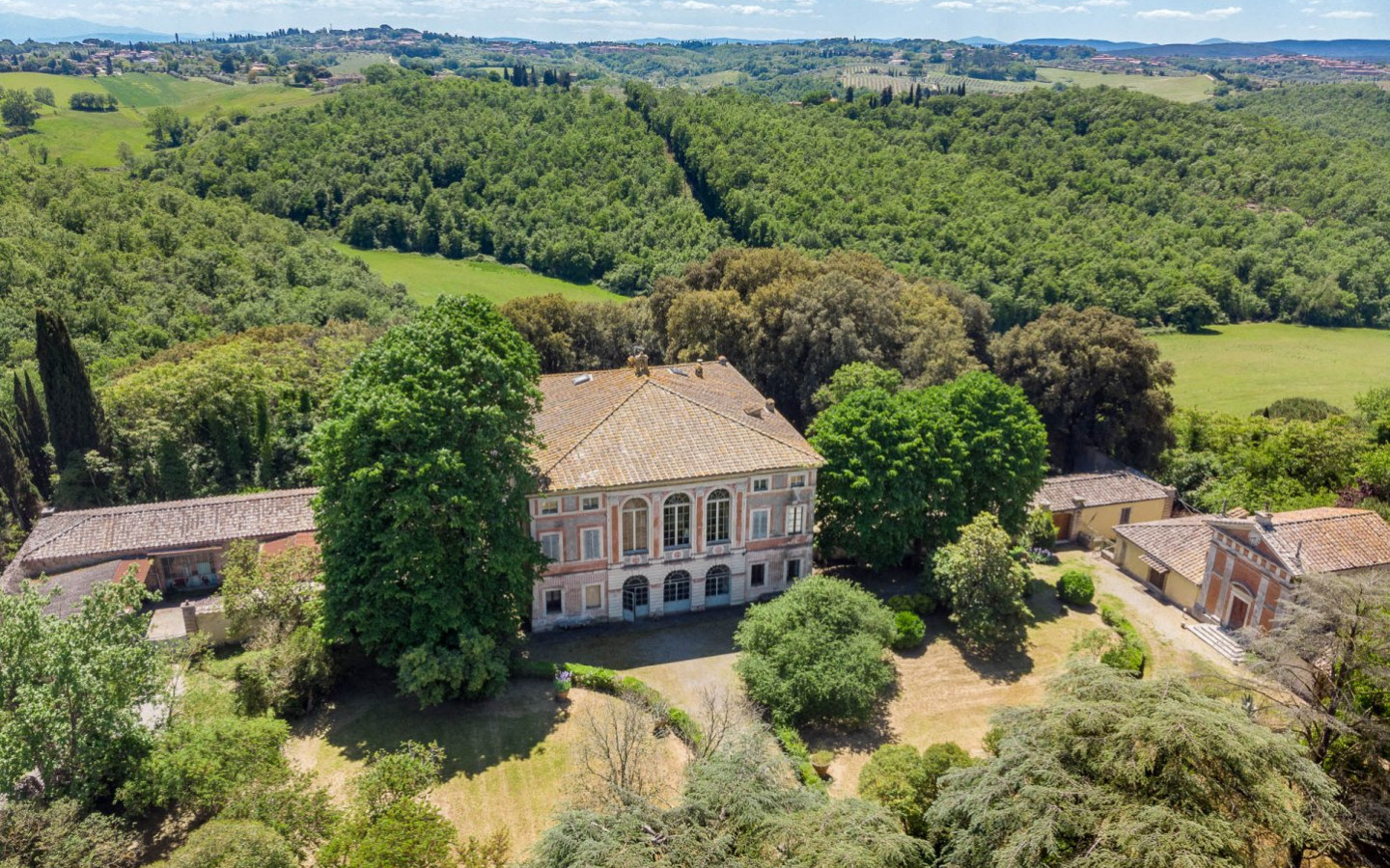 In the countryside north of Siena, in the heart of Chianti Classico, on the ancient Chiantigiana route just minutes from Monteriggioni Castle, prestigious Eighteenth-century villa with annexes and original chapel on over 3.5 hectares (9.3 acres) of private land with driveway, historic garden and typical woods. Villa Parigini was built in 1750 by the Sansedoni family and stars a classic quadrangular plan with three-arched loggias and porticoes, spread over two manor floors plus an attic. The interiors preserve great frescoed halls, a porticoed atrium, a central travertine staircase, and glass-fronted galleries overlooking the historic garden and woods. Each room retains evocative historical details, stucco decorations, stone busts and statues, double-height ceilings, frescoes and paintings, one with an authentic coat of arms. Overlooking a typical inner courtyard, are the winter garden, the former stables, the chapel, and former farm buildings with deposits and offices.