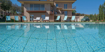 Piscina: a forma irregolare circa 18x7 mt, posizione panoramica, area solarium pavimentata in cotto