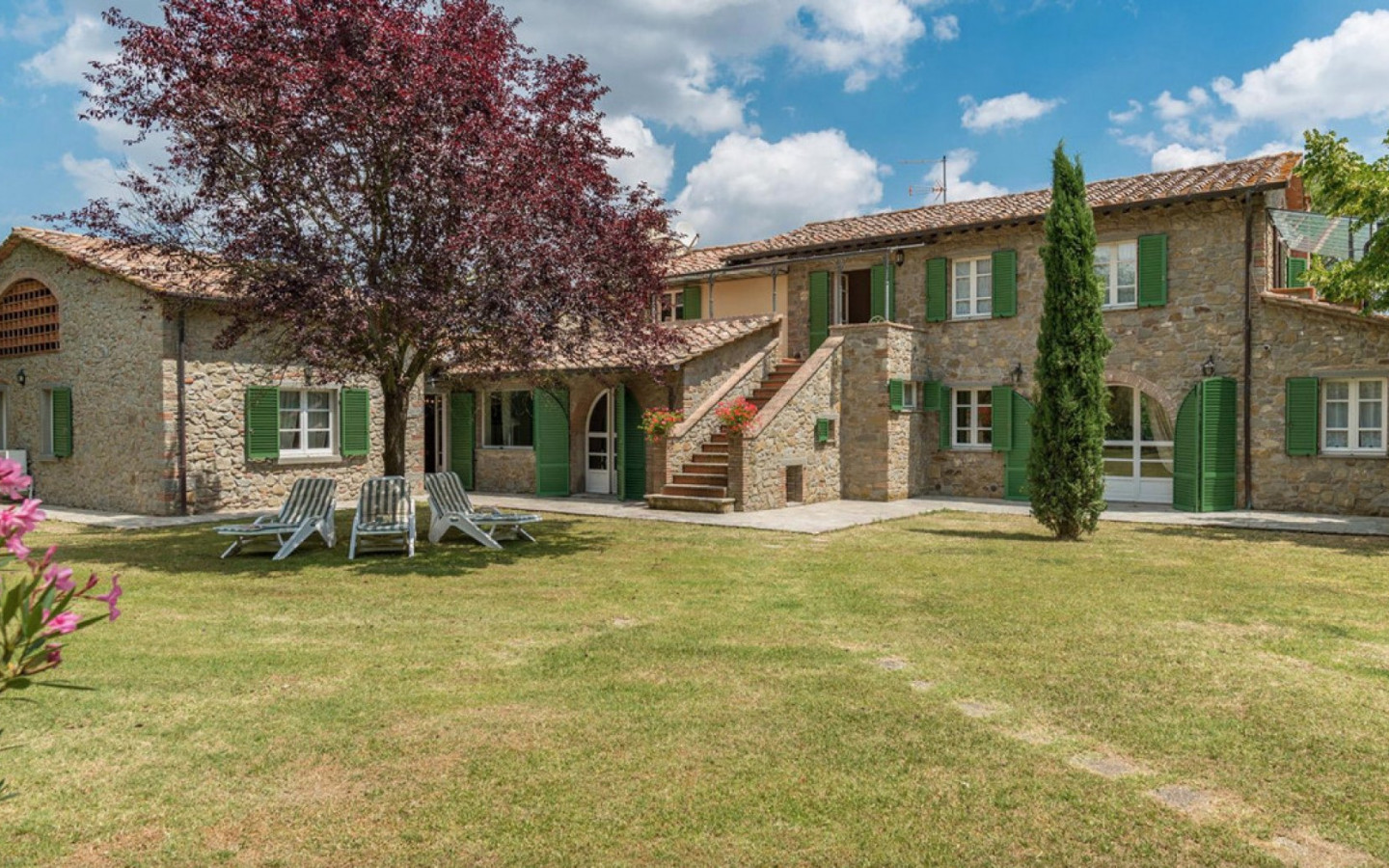 Casale in pietra elegantemente ristrutturato in villa con sei camere e piscina, in vendita nella campagne alle porte di Cortona, Arezzo. Nel cuore della Valdichiana, al confine fra la Toscana e l’Umbria, a venti di minuti dal Lago Trasimeno e da Montepulciano, in zona pianeggiante e riservata, comodamente raggiungibile grazie ad un breve tratto di strada bianca, si trova Casale La Bellezza, così chiamato per l’autenticità e l’eleganza dei suoi materiali. Realizzato in pietra ai primi del 1800, è stato magnificamente ristrutturato nel 2010 creando un’atmosfera accogliente e familiare, ricca di fascino e caratteri storici che si ritrovano nel camino in pietra del salotto e nel camino rustico della cucina, nei soffitti con travi di legno a vista, nelle pareti in pietra e nei pavimenti in cotto. Gli infissi sono stati tutti completamente sostituiti con porte e finestre termiche e si abbinano perfettamente agli sportelloni esterni in legno in tradizionale color verde salvia. Il piano terra ospita tre camere con bagno privato, mentre al piano primo, raggiungibile da una scala in pietra, una camera padronale con bagno e terrazzo, due camere e un bagno. Il giardino è stato pensato con zone a prato, aiuole, olivi, pini e alberi ad alto fusto e dove si trova una piscina con scala alla romana e rivestimento in pietra. Oggi Casale La Bellezza è scelto da viaggiatori di tutto il mondo per le loro vacanze, un luogo spettacolare dove rilassarsi e rigenerarsi, perfetto anche come residenza privata da vivere con famiglia e amici.